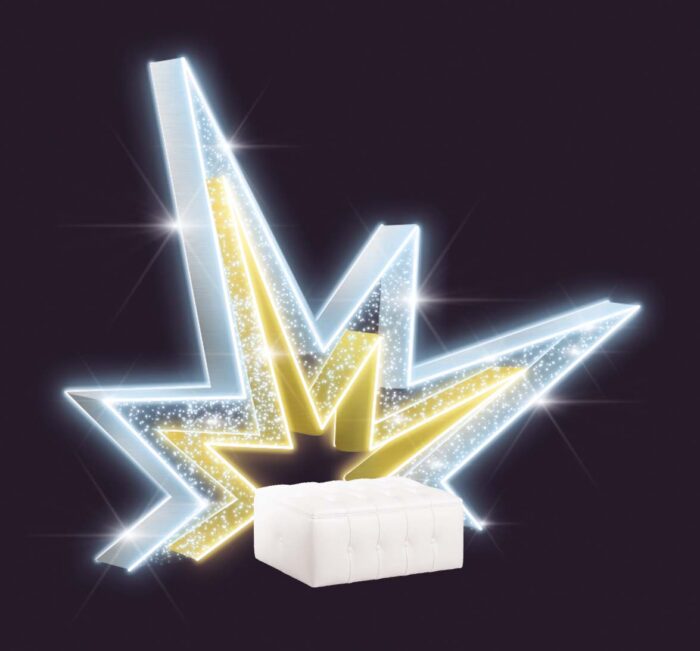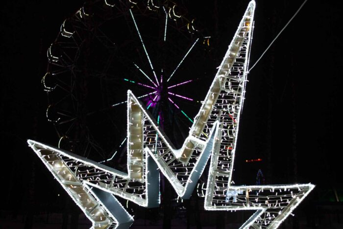 Размер фотозоны — 3×3 м. Холодное белое свечение создаёт чистую, элегантную и праздничную атмосферу. Высокая детализация каркаса и чёткая геометрия делают фотозону уместной в любом окружении: от парка или сквера до фуд-корта или торговой галереи.