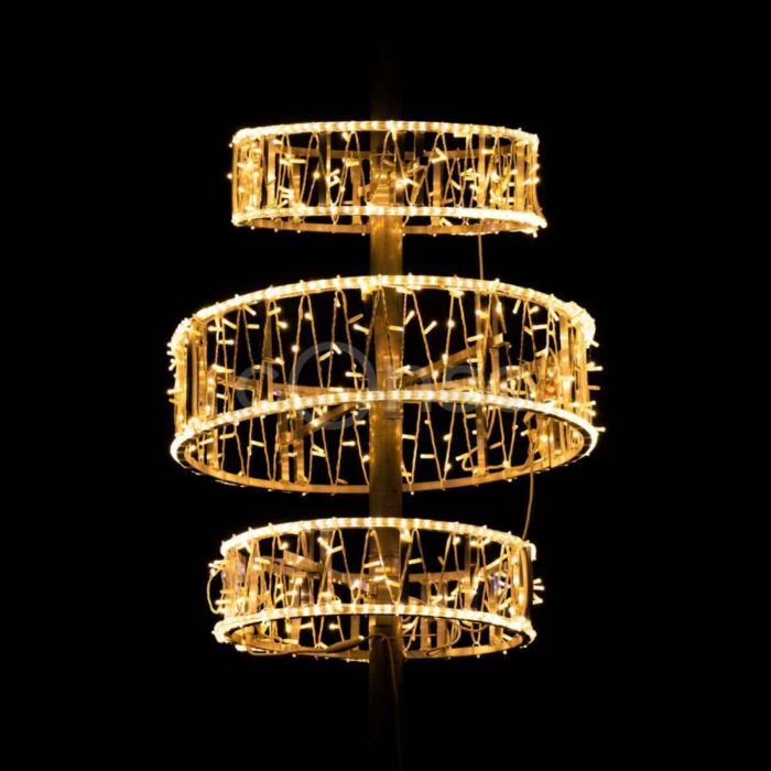 Новогодняя световая консоль «Золотые кольца» — это стильный и компактный элемент архитектурной подсветки, который мгновенно преобразит городское пространство. Минималистичная форма, элегантное золотое свечение и продуманная конструкция делают эту консоль отличным выбором для оформления опор наружного освещения, фасадов зданий, входных групп и общественных зон.