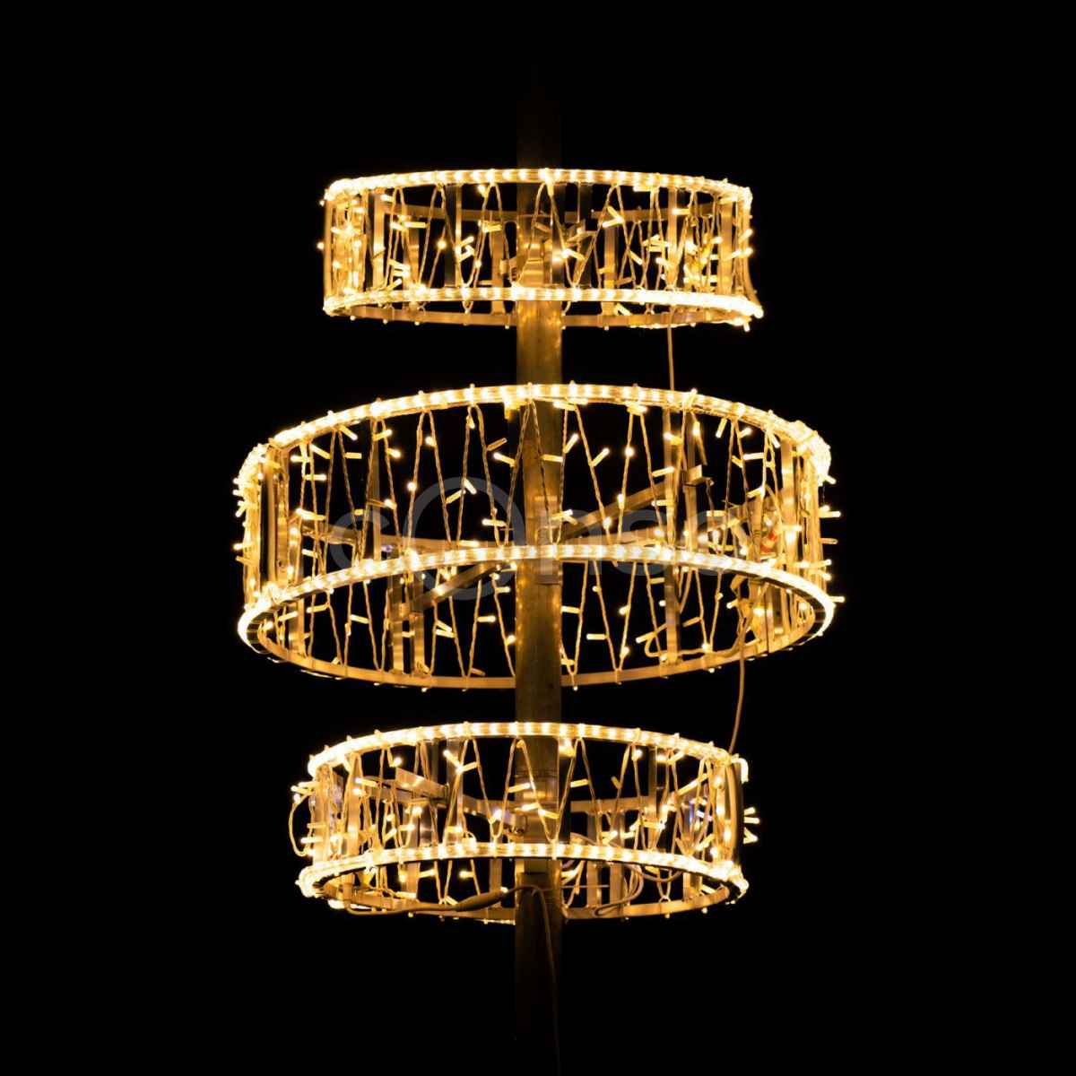 Световая консоль «Золотые кольца» — элегантный уличный декор для новогоднего оформления фасадов, опор освещения и входных зон. Размер — 1×1,2 м, свечение — золотое. Каркас из алюминия, надёжная защита IP65, готова к эксплуатации при –50 °C. Монтаж под ключ от JOYLED.