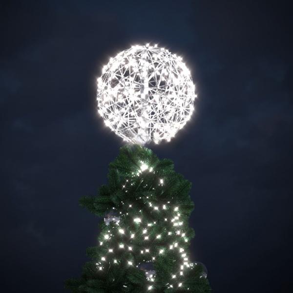 Световая макушка «Жемчужина» — это финальный акцент в оформлении уличной новогодней ели. Фигура выполнена в виде объёмного светящегося шара с холодным свечением, благодаря которому создаётся ощущение сияющей жемчужины, венчающей вершину дерева. Она помогает сформировать цельный, завершённый образ — делает ёлку выразительной, притягательной и узнаваемой издалека.
