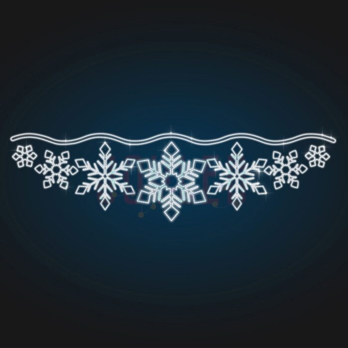 Световая перетяжка «Снежинки» — готовое решение для новогоднего оформления улиц, фасадов, арок и проездов. Размер 5×1,3 м, холодное белое свечение, надёжная конструкция из алюминия, защита IP65. Работает при температуре от –50 до +40 °C. Поставка и монтаж под ключ от JOYLED.