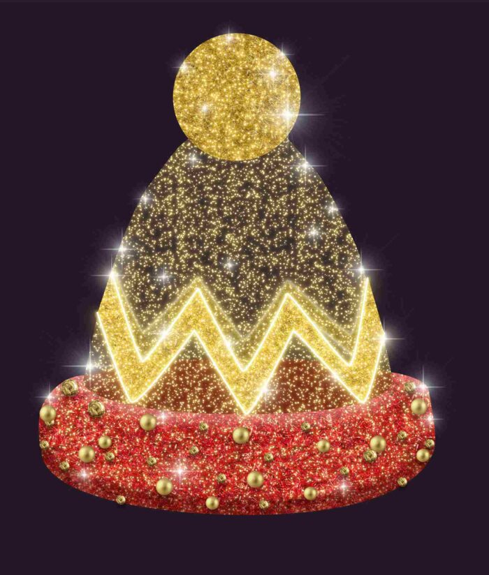 Светится шапка в красно-золотых оттенках, что делает её визуально тёплой и эффектной в вечернее время. Цвета создают благородный и праздничный образ, хорошо работающий на эмоции прохожих, гостей и клиентов.