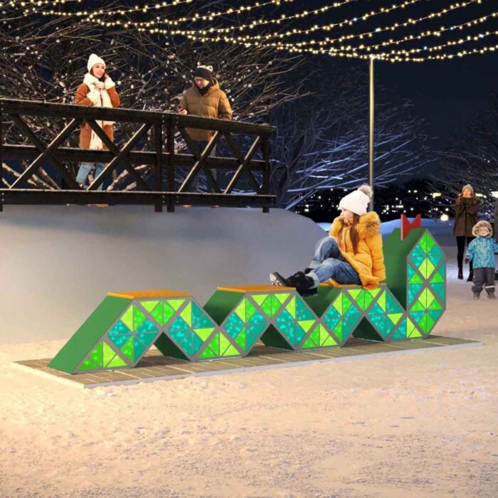 Фигура выполнена в виде змеи — животного, символизирующего мудрость, движение и трансформацию. Такой арт-объект притягивает внимание, выделяется на фоне традиционного благоустройства и подчёркивает уникальность места. Особенно эффектно скамейка смотрится в тёмное время суток благодаря встроенной разноцветной подсветке.