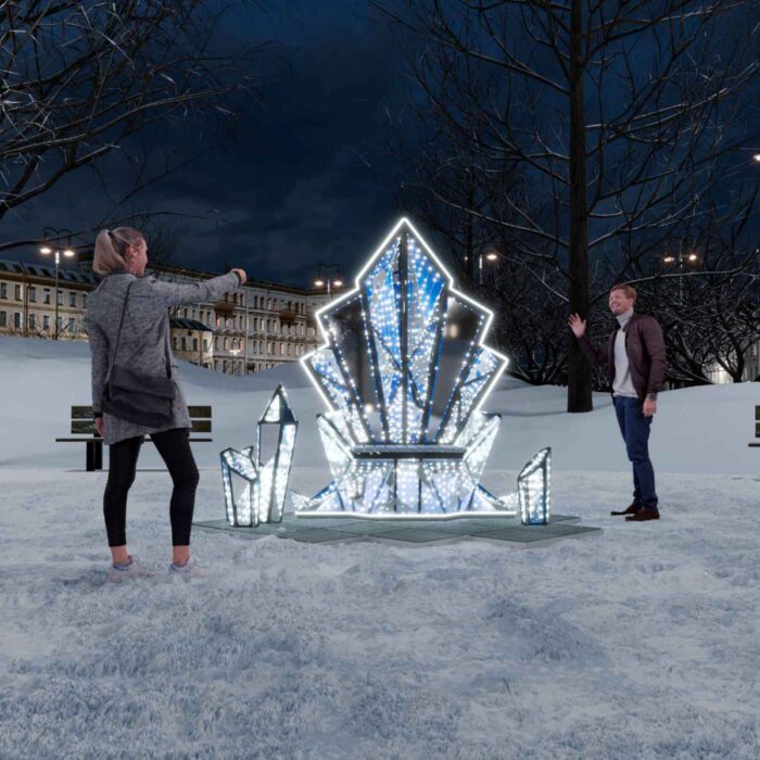 Объёмная 3D-фигура имеет выразительный полигональный дизайн — её «грани» напоминают огранённый кристалл, отсюда и название. Холодный белый свет подчёркивает структуру и создаёт эффект ледяного трона, особенно выразительно смотрится в вечернее и ночное время.