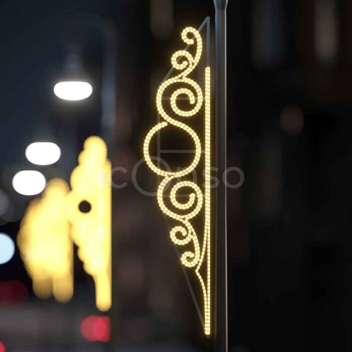 Световая консоль «Завитки» — элегантный декоративный элемент с витиеватыми узорами и тёплым золотистым свечением. Выполнена на алюминиевом каркасе, стойком к коррозии и погодным условиям. Размер 0,6×2,5 м позволяет крепить консоль на фонарные опоры и фасады. Идеально подходит для новогодних, городских или праздничных оформлений. Поставка включает монтажный комплект и электроподключение.