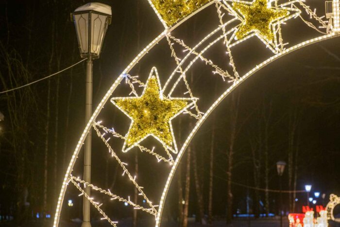 Муниципальные заказчики устанавливают арки над центральными улицами для создания праздничной атмосферы. Достаточная высота позволяет не перекрывать движение общественного транспорта и грузовиков.