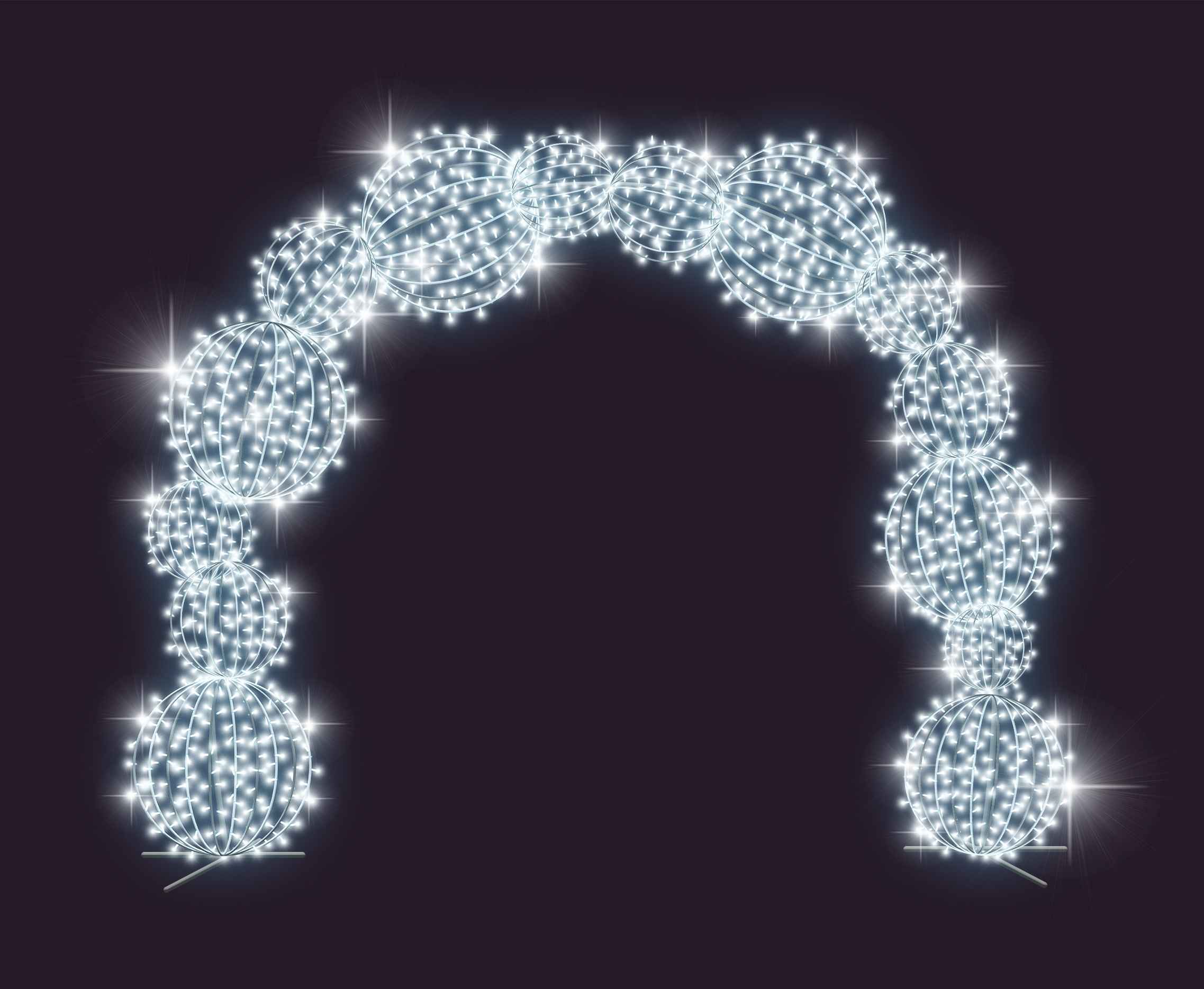 Холодное белое свечение подчёркивает строгость и элегантность арочной конструкции. Такой цвет света ассоциируется с чистотой, торжественностью и создаёт ощущение праздничной свежести.