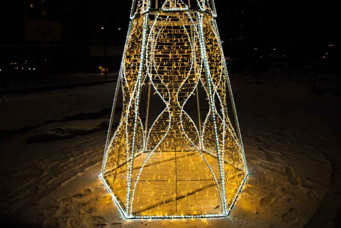 Световая ель «СК-201-12» — это компактное и надёжное решение, подходящее как для частных участков, так и для масштабных городских оформлений. Её можно использовать как отдельный элемент или в составе комплексной инсталляции. Благодаря высокой яркости и чистоте линий она не теряется на фоне городской архитектуры и идеально дополняет зимний пейзаж.