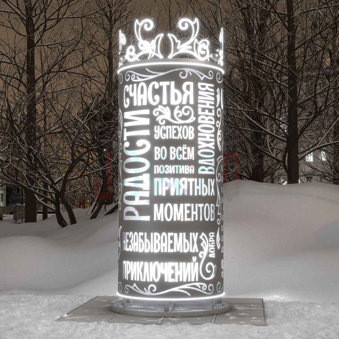 Объёмная световая фигура в виде праздничной афиши с пожеланиями создаёт атмосферу тепла и уюта. Идеальна для украшения улиц, парков, площадей и входных групп. За счёт открытого дизайна и холодного свечения становится фотозоной и арт-объектом в одном решении. Подходит для установки на любых городских площадках.