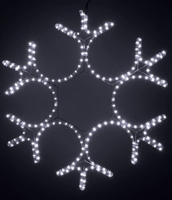 Белое свечение — нейтральное и универсальное. Оно подходит как для делового, так и для уютного оформления. В городском пространстве такая снежинка выглядит чисто, современно и ярко; в частном доме — добавляет архитектуре лёгкости и праздничного настроения.