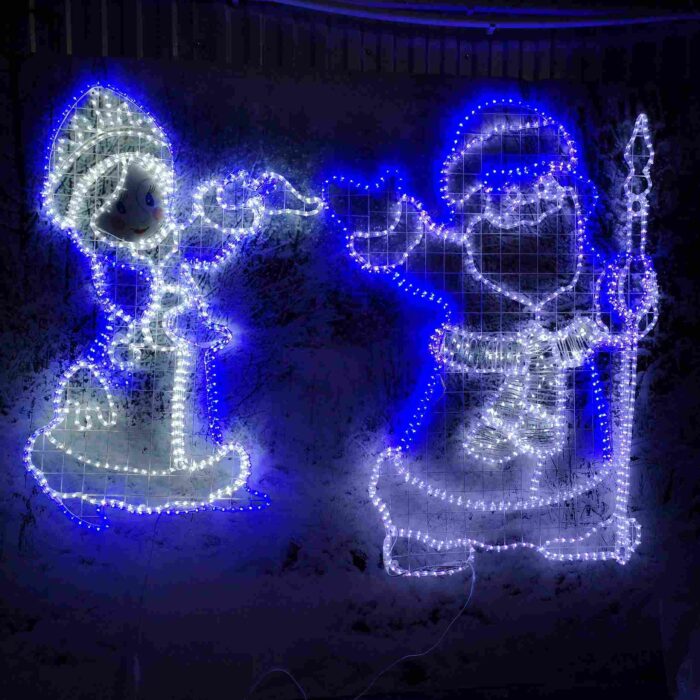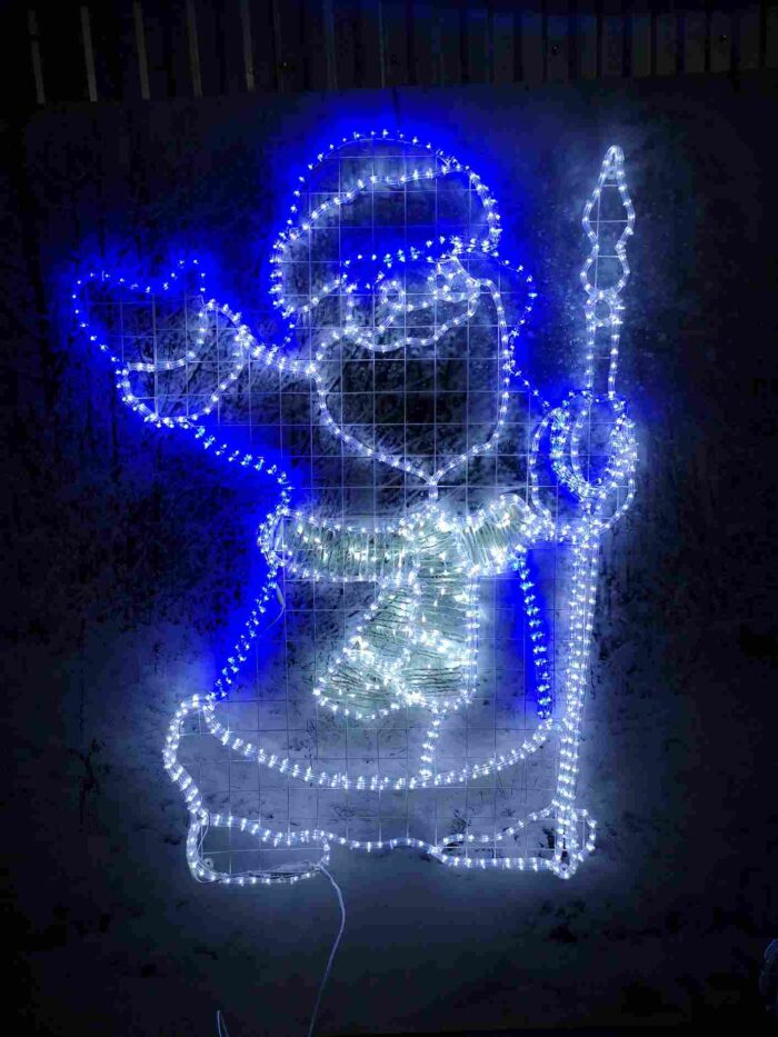 Варианты высоты: 1,5 м, 1,7 м и 2 м. Световое исполнение — на выбор: можно выбрать тёплый, холодный, красный, синий или комбинированный оттенок. Фигура подключается к сети 220 В, монтаж занимает от 1 до 2 часов.