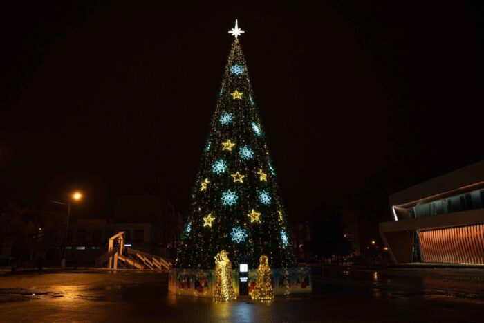 Размер 10 метров позволяет разместить конструкцию даже в ограниченном пространстве — во дворе ТЦ, между зданиями, на бульваре или аллее. Ель остаётся заметной и праздничной, но не требует сложной логистики или спецтехники для установки.