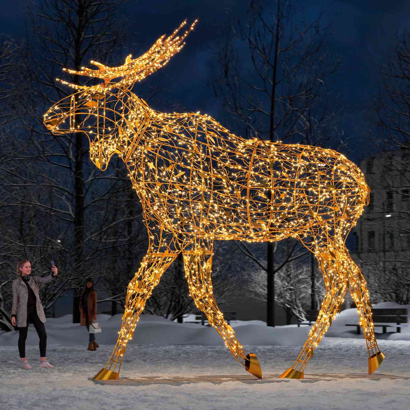 Световая фигура «Лось» — это мощный визуальный акцент, который невозможно не заметить. Его величественный силуэт в сочетании с мягким, эффектным свечением создаёт атмосферу волшебства и уюта. Это идеальное решение для украшения городских пространств, зимних фестивалей, входных групп торговых центров и других общественных локаций. Фигура обладает внушительными размерами — почти 5 метров в ширину и более 4 метров в высоту. Благодаря этому она становится центральным элементом оформления и фоном для десятков фотосессий ежедневно.