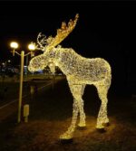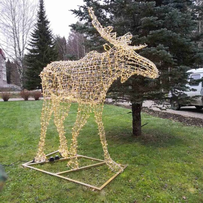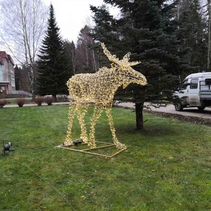 Фигура «Лось» — эффектный световой объект для улиц, парков и входных зон. Тёплый белый свет, стальной каркас с антикоррозийной обработкой, IP65. Высота 1,8 м, возможны другие размеры. Устойчивая, безопасная, привлекает внимание и создаёт атмосферу праздника.