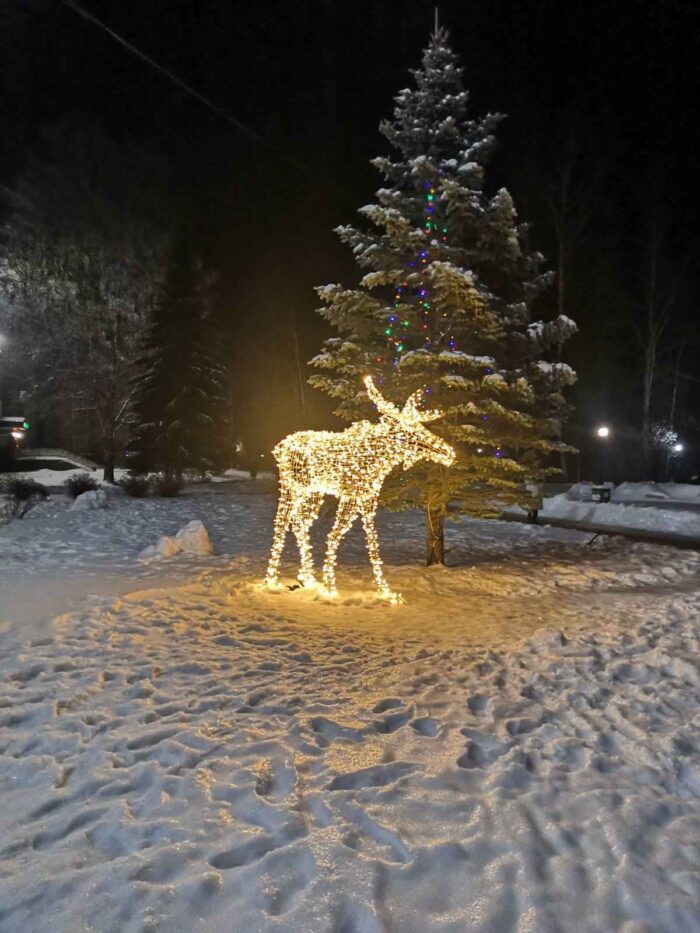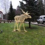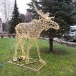 Лось отлично сочетается с другими нашими фигурами: медведем, ёлкой, мишурными и каркасными объектами. Вы можете собрать целую композицию под территорию — как для города, так и для частного посёлка.