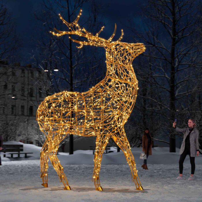 Световая фигура «Олень» высотой 3,5 метра — это не просто уличная декорация, а по-настоящему запоминающийся элемент городского или коммерческого оформления. Такая композиция сразу притягивает внимание, создаёт ощущение сказки и уюта, особенно в зимний период. Элегантный силуэт животного, холодное свечение в золотом или серебряном исполнении и массивный 3D-каркас превращают фигуру в центр притяжения и фотозону одновременно.