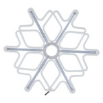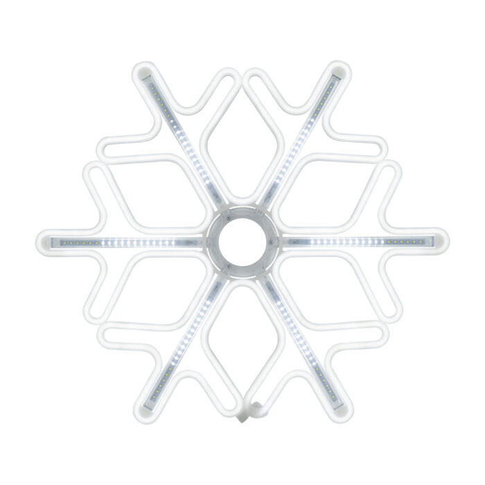 Уличная световая фигура «Снежинка» из гибкого неона с белым свечением и эффектом «тающей сосульки». Подходит для фасадов, витрин, городских площадей, парков и входных групп. Полная пылевлагозащита IP65, монтаж под ключ. Работает при температуре от -25 до +40 °С.