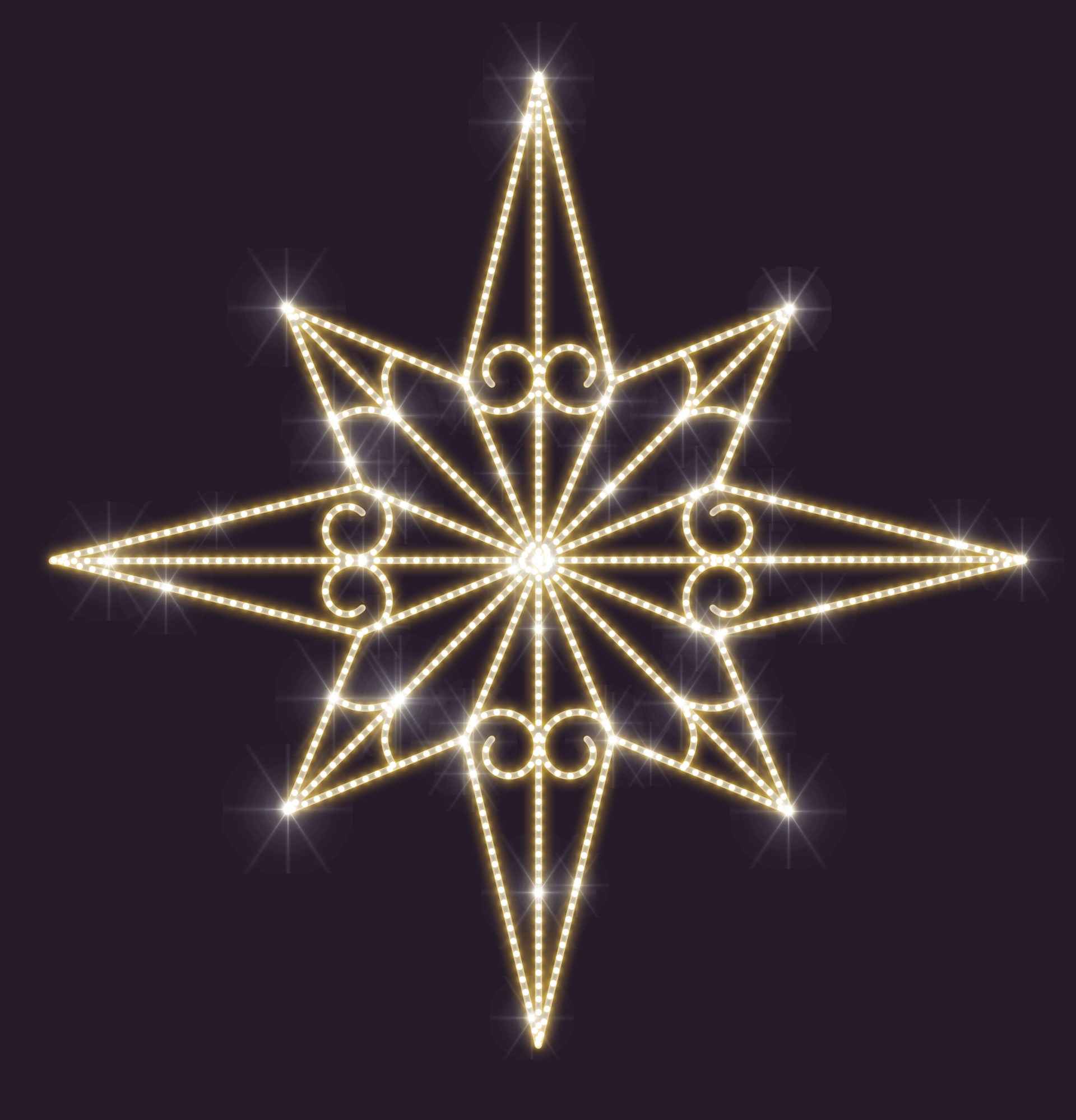 Размер звезды — 1,8×1,8 м. Конструкция плоская (2D), каркас выполнен из металла, устойчивого к воздействию влаги и низких температур. Фигура рассчитана на использование в условиях русской зимы, подходит как для краткосрочного монтажа, так и для сезонного размещения.