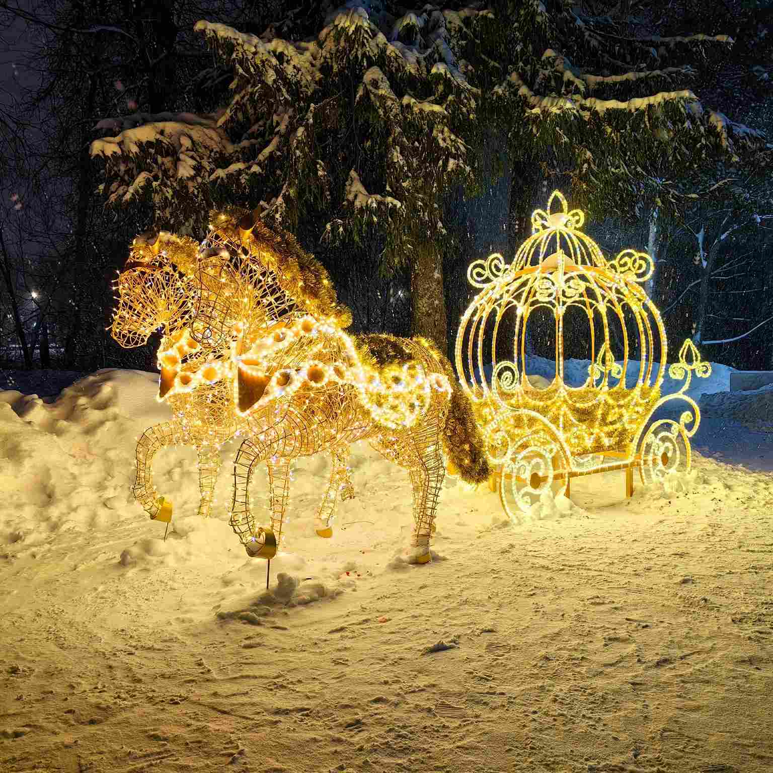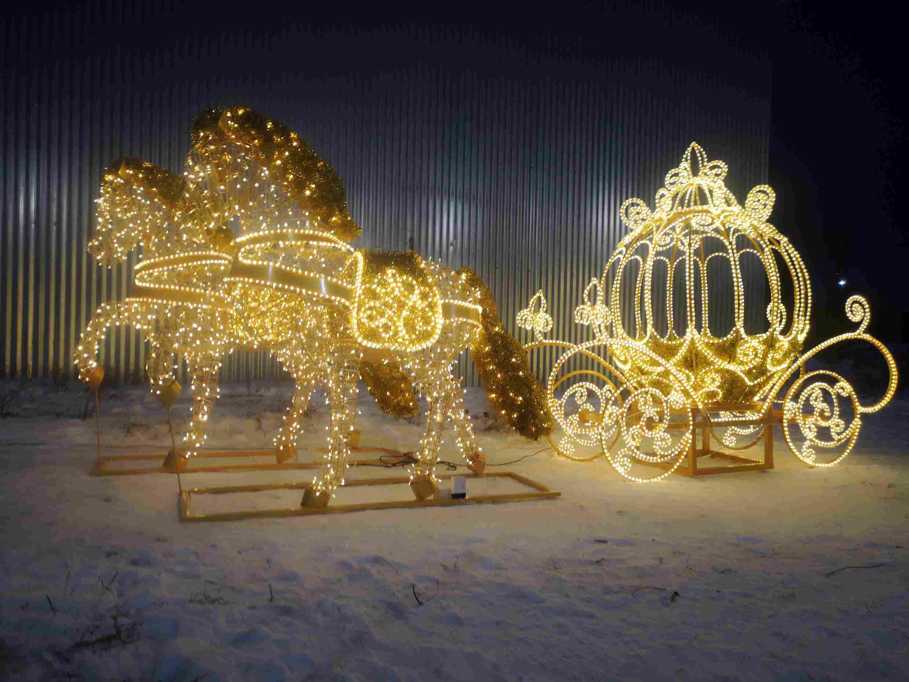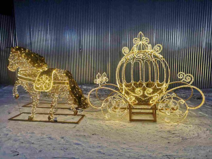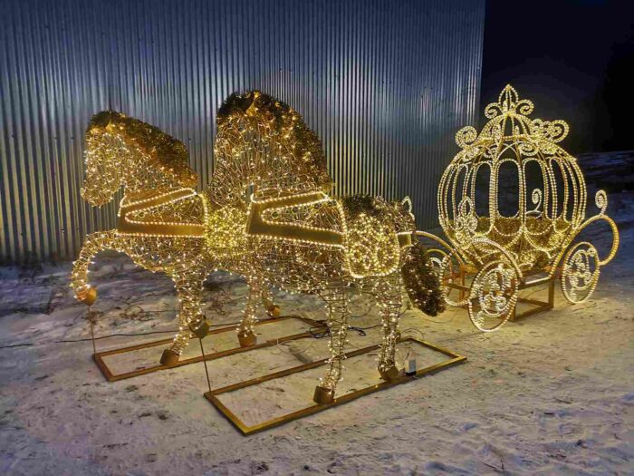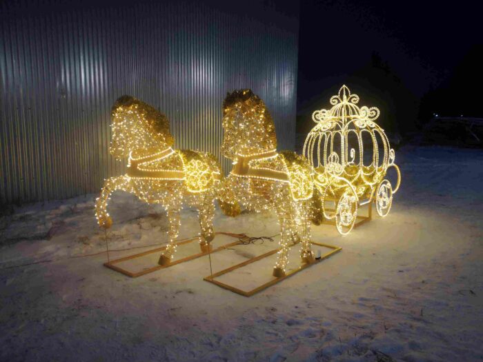 Карета с лошадьми гармонично сочетается с арками, световыми деревьями, надписями и другими фигурами, образуя цельные праздничные композиции.
