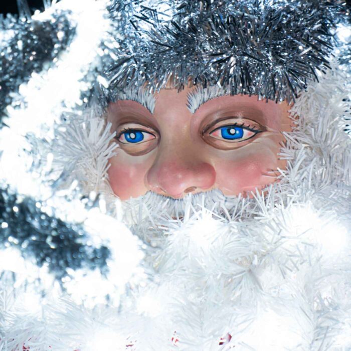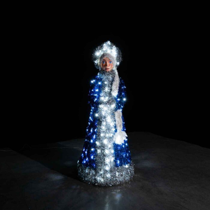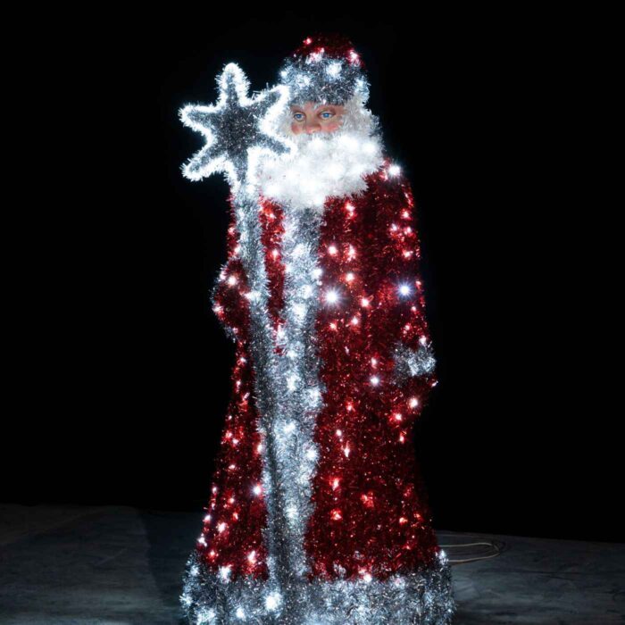 Все элементы композиции — Дед Мороз, Снегурочка и мешок — выполнены на прочном алюминиевом каркасе. Это лёгкий и долговечный материал, устойчивый к коррозии и рассчитанный на многолетнюю уличную эксплуатацию. Снаружи конструкции обтянуты яркой мишурой, создающей праздничную текстуру и подчёркивающей форму фигур.
