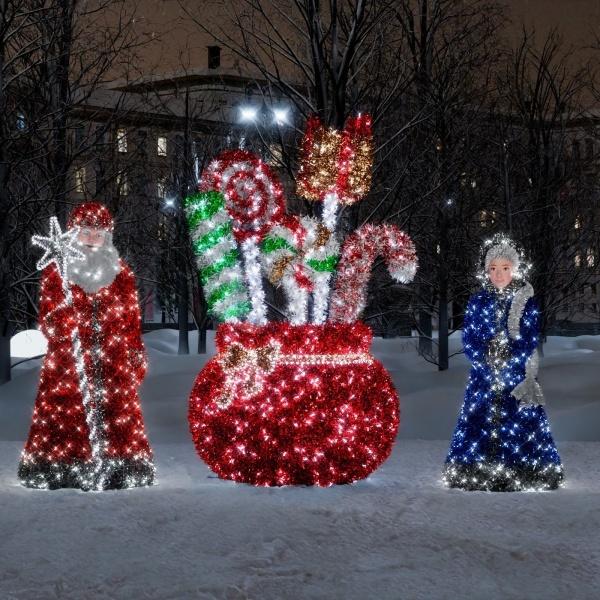 Световая композиция «Дед Мороз, Снегурочка и Сказочный мешок» — готовая новогодняя сцена для улицы