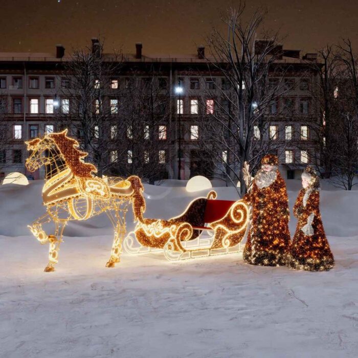 Золотая световая композиция JOYLED «Лошадь с санями и Дед Мороз со Снегурочкой» создаёт эффектную праздничную атмосферу. Устойчива к морозам и влаге, подходит для улицы, ТРЦ, парков и площадей. Комплект включает лошадь, сани, Деда Мороза и Снегурочку. Долговечный алюминиевый каркас и надёжные LED-огни обеспечивают безопасность и яркий свет. Возможен монтаж под ключ.