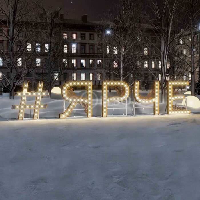 Объёмная уличная надпись «Ярче» — эффектная световая фигура для новогоднего оформления парков, ТЦ и городских пространств. Размер — почти 10 метров в длину. Надпись выполнена из алюминиевого каркаса, оснащена золотыми светодиодами, рассчитана на уличное использование при температуре от –50 до +40 °C. Отлично работает как фотозона и как точка притяжения внимания.