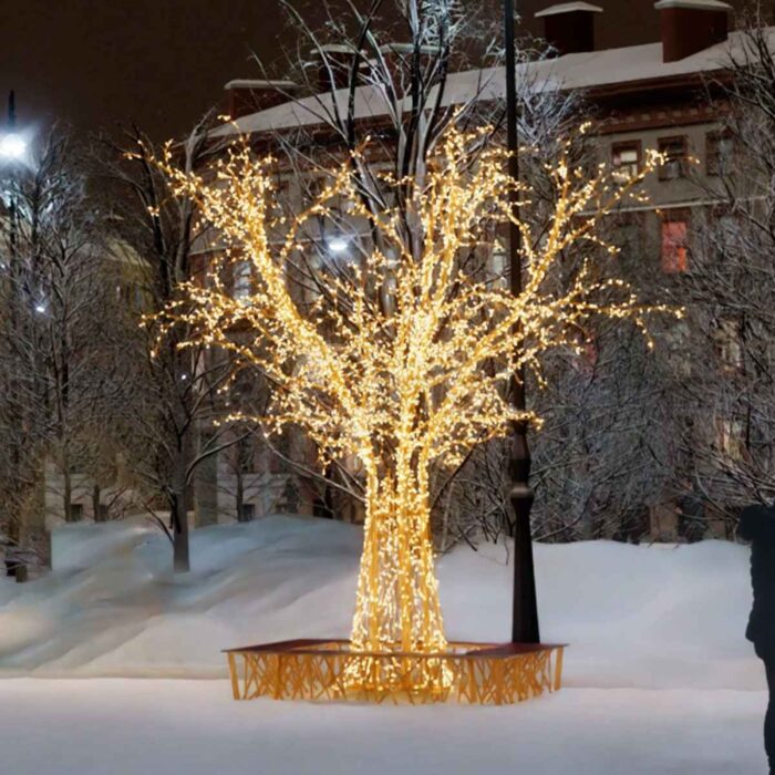 Это решение не требует дополнительного обрамления. Достаточно аккуратно установить дерево на прочное основание, подключить питание — и локация будет готова к приёму гостей.
