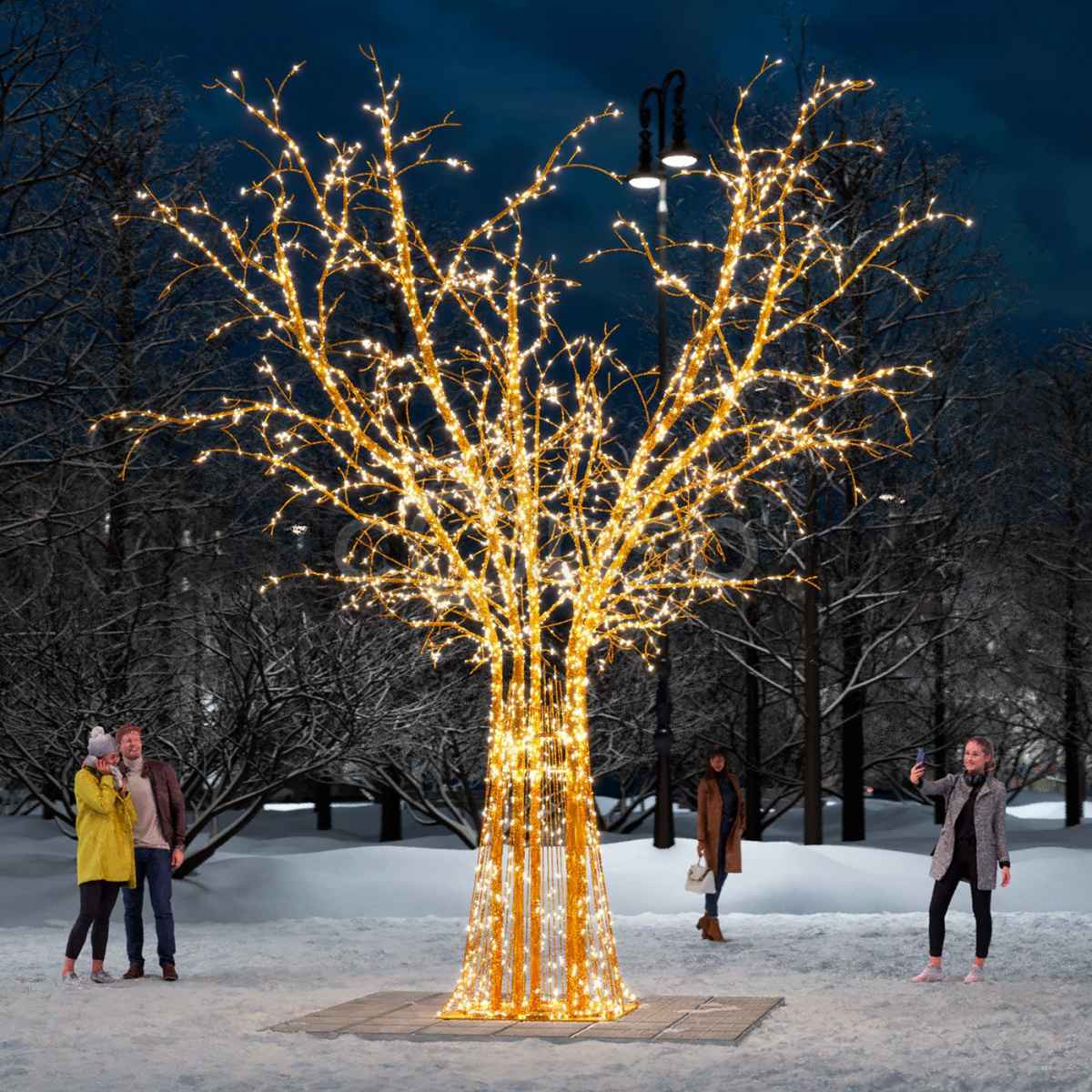 Световая фигура «Ветвистое дерево» — масштабный арт-объект для улицы. Размер: 5,4×5,3×5,4 м. Эффектный золотой или серебряный свет, алюминиевый каркас с окраской, защита IP65. Устанавливается во дворах, на площадях и в ТЦ. Подходит для зимы. Комплектуется плитами пригруза.