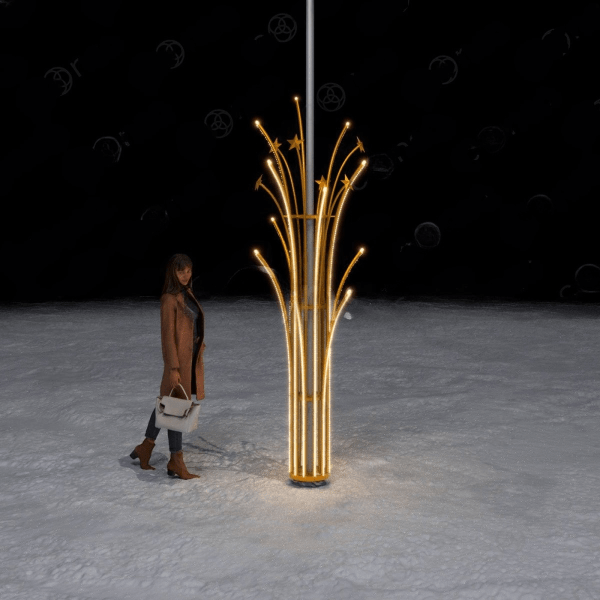 Световое украшение «Салют» 3D GR 906 превращает обычные опоры освещения в элементы праздничного фейерверка. Высота 2,9 метра создаёт внушительное вертикальное присутствие, а компактное основание 0,85×0,85 метра позволяет установку на стандартные опоры без модификации.