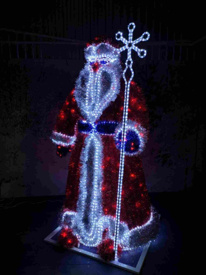 Классическая световая фигура Деда Мороза с выбором высоты от 1,7 до 2,3 метра и любого цвета свечения. Стальной каркас с антикоррозийным покрытием выдерживает морозы до -50°C. Вес 45 кг обеспечивает устойчивость конструкции. Степень защиты IP65 гарантирует надёжную работу в любую погоду. JOYLED производит новогодние световые фигуры с индивидуальной настройкой освещения для создания праздничной атмосферы.