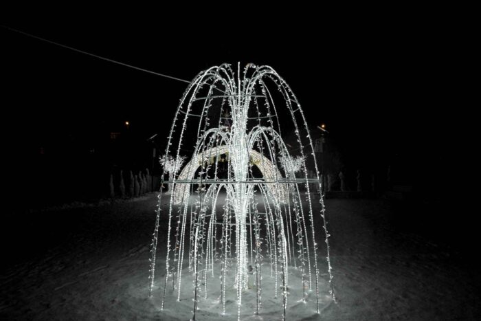 Такое оформление уместно как на центральной площади города, так и у входа в торговый центр или бизнес-здание. Световой фонтан подчёркивает статус объекта, привлекает внимание и создаёт впечатление масштабного, хорошо организованного праздника.