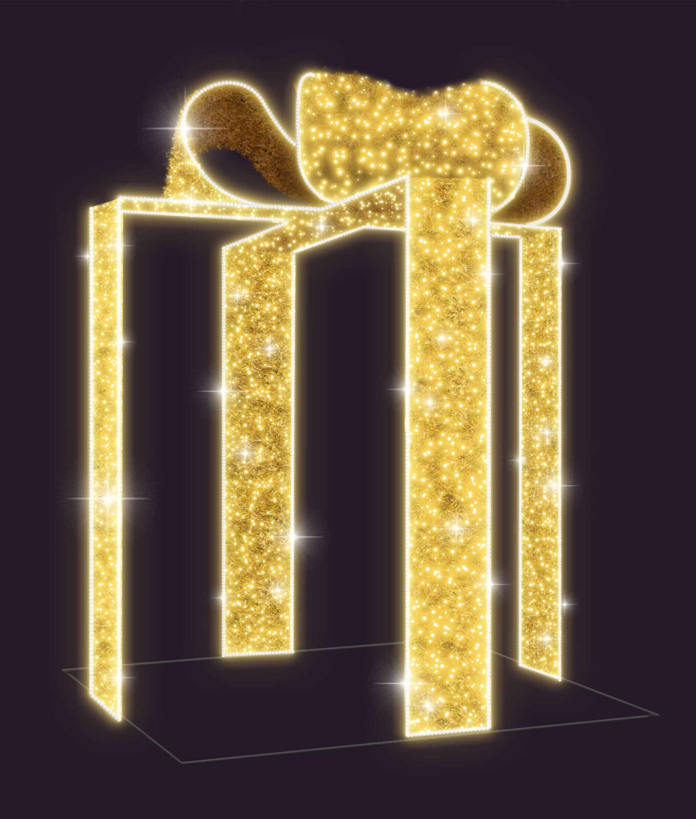 Световой подарок СК-163 высотой 3,5 м — эффектная инсталляция для улиц, парков, торговых центров и площадей. Золотое свечение создаёт праздничное настроение, а надёжный металлический каркас с защитой IP65 гарантирует долгий срок службы при любых погодных условиях. Идеален для новогоднего оформления, городских праздников и фотозон. Прост в монтаже, экономичен и долговечен.