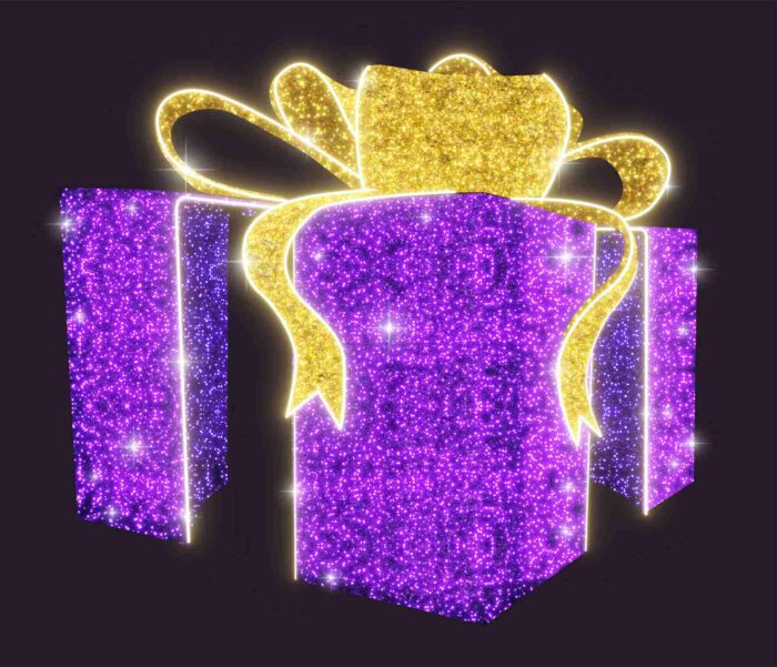 Световой подарок JOYLED СК-182 — яркая объёмная фигура 3×3,5 м с фиолетовым и золотым свечением. Металлический каркас и защита IP65 обеспечивают надёжность в любую погоду, а срок службы светодиодов достигает 50 000 часов. Подходит для украшения улиц, площадей, торговых и бизнес-центров, а также для фотозон. Доступно изготовление под заказ и монтаж под ключ.