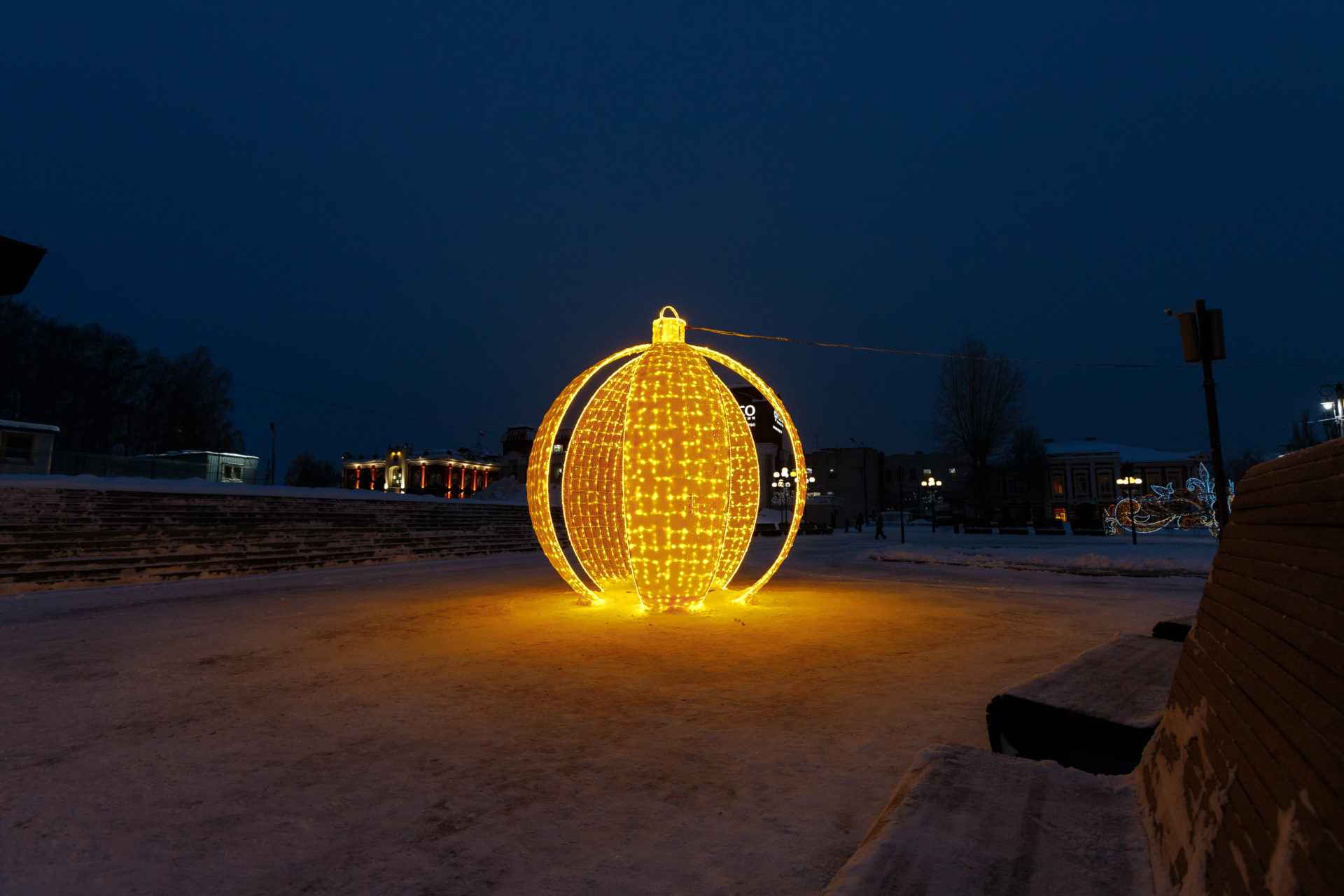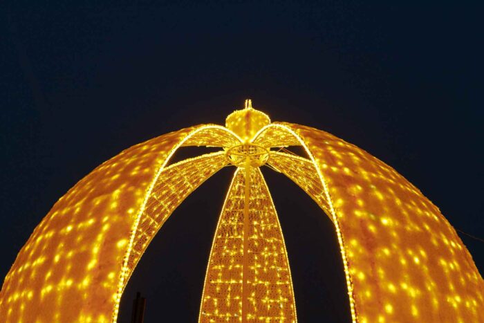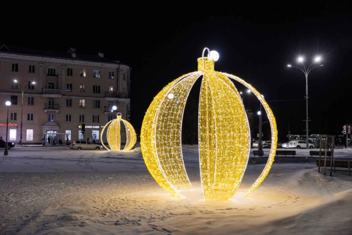 С его помощью можно создать праздничное настроение и усилить визуальное восприятие пространства в тёмное время суток. Благодаря размеру 4×4,3 м, фигура хорошо заметна издалека, а её сферическая форма создаёт эффект объёма и света, привлекающего внимание посетителей, прохожих и гостей.