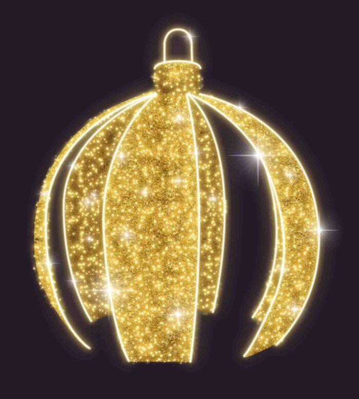Световой шар СК-164 — это крупногабаритная декоративная фигура с тёплым золотым свечением, предназначенная для оформления общественных пространств, улиц, площадей, торговых центров, входных групп и новогодних инсталляций.