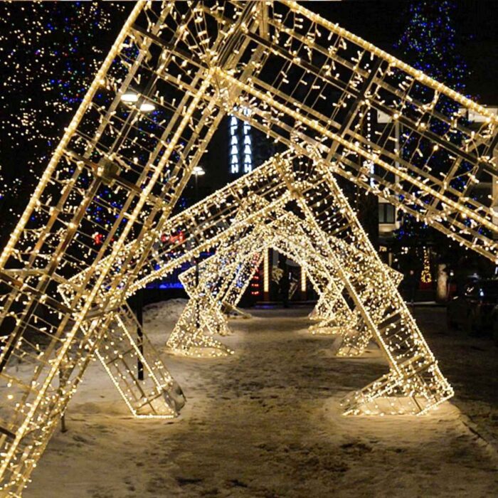 Особенно популярна такая форма у организаторов новогодних и рождественских ярмарок, управ компаний и девелоперов, украшающих дворы ЖК и территории возле зданий. Тоннель сочетается с ёлками, гирляндами, световыми фигурами и создаёт целостный сценарий подсветки.