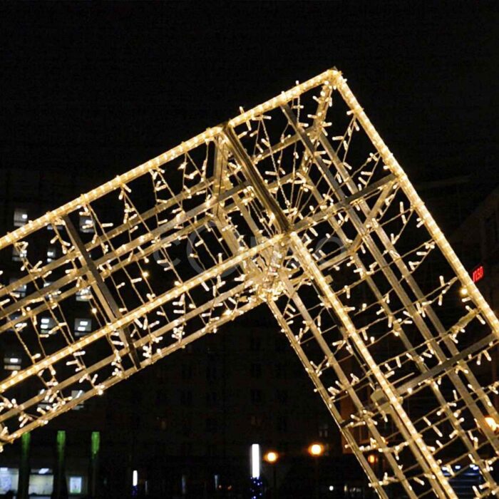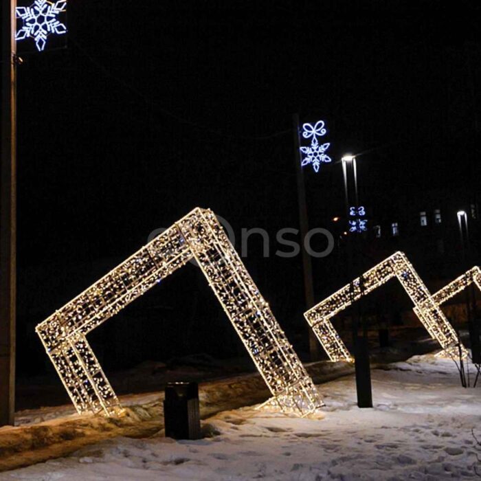 Световой тоннель «Ромбы» — эффектная уличная конструкция из двух арок с золотым свечением. Создаёт фотозону, праздничный проход или визуальный акцент в парке, у ТЦ или на площади. Устойчивая, алюминиевая, IP65, монтаж под ключ. Идеально подходит для новогоднего оформления, работает при любых погодных условиях.