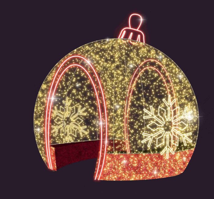 Объёмный световой шар высотой 4,3 м — эффектный акцент для городской площади, торгового центра или фотозоны в парке. Красное и золотое свечение создаёт атмосферу праздника и уюта. Конструкция устойчива к морозам, снегу и дождю. Шар можно использовать как самостоятельный арт-объект или часть инсталляции. Надёжная сборка и монтаж под ключ от JOYLED.