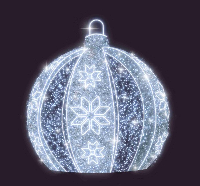Серебряное свечение создаёт атмосферу зимней свежести и элегантности. Такой шар одинаково эффектно смотрится и в вечернее время, и в дневные часы, отражая солнечный свет и усиливая блеск композиции.