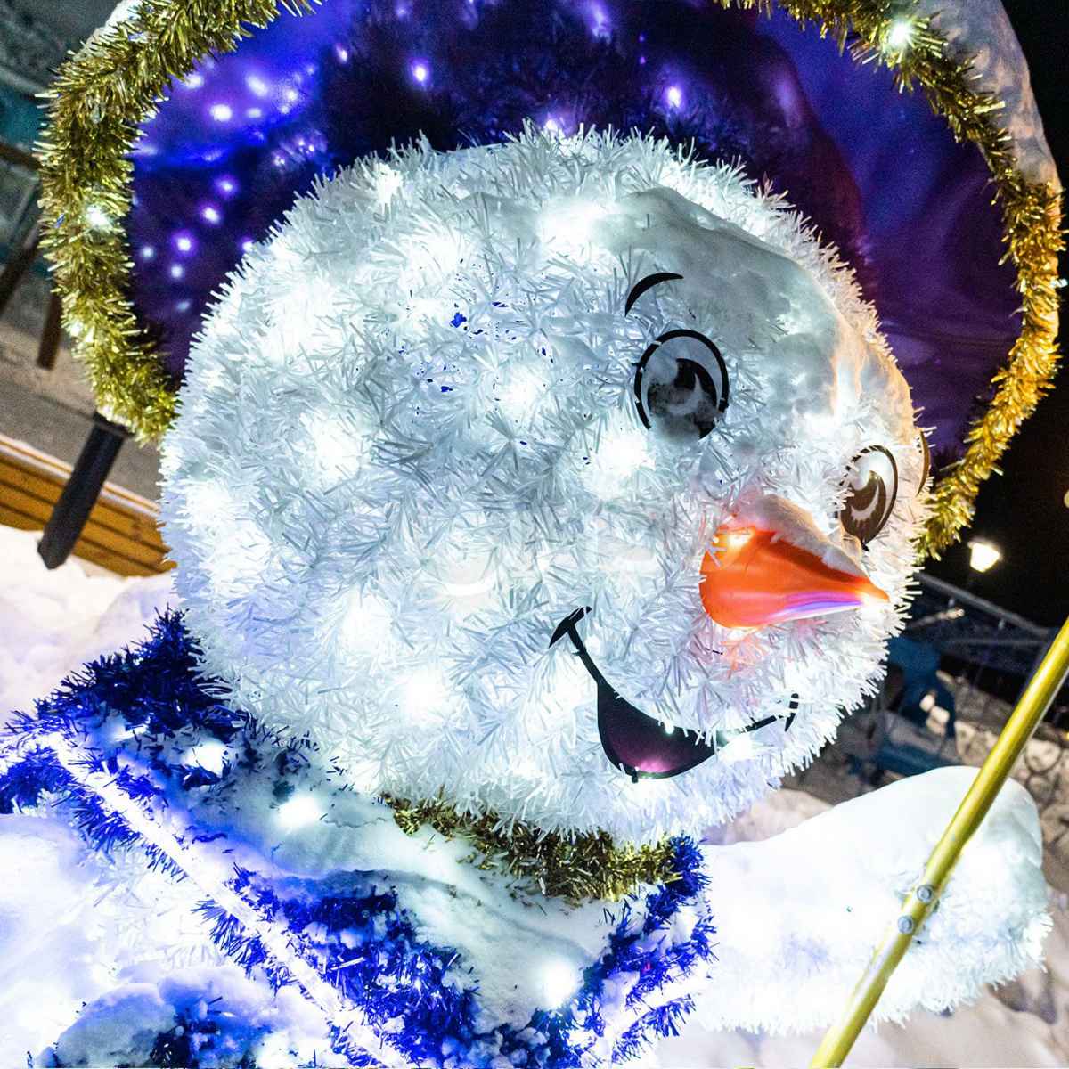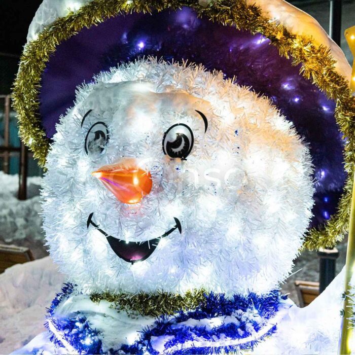 Объёмная фигура снеговика из мишуры с холодным свечением. Высота 2,5 м. Идеальна для улиц, парков, ТЦ и новогодних фотозон. Каркас — алюминий, IP65. Устойчива, безопасна, готова к монтажу под ключ. Отлично работает как самостоятельный объект или в составе праздничной композиции.