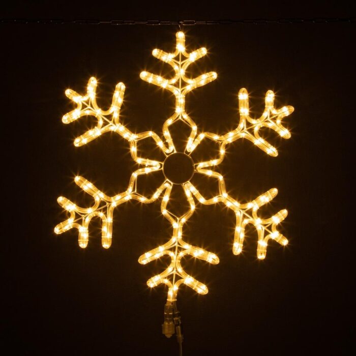 Световая фигура в виде снежинки — универсальный элемент, который подходит для оформления частных, коммерческих и городских объектов. Диаметр 60 см, чёткая форма и тёплое свечение делают её идеальной для размещения на фасадах, козырьках, оконных проёмах, витринах и опорах.