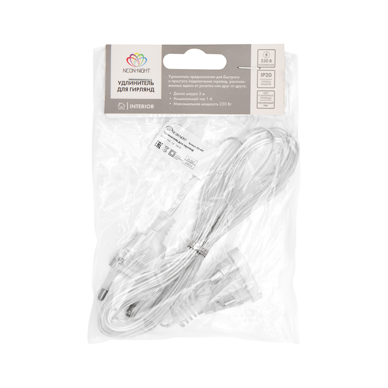 Удлинитель для домашних гирлянд 3м, Провод Прозрачный ПВХ