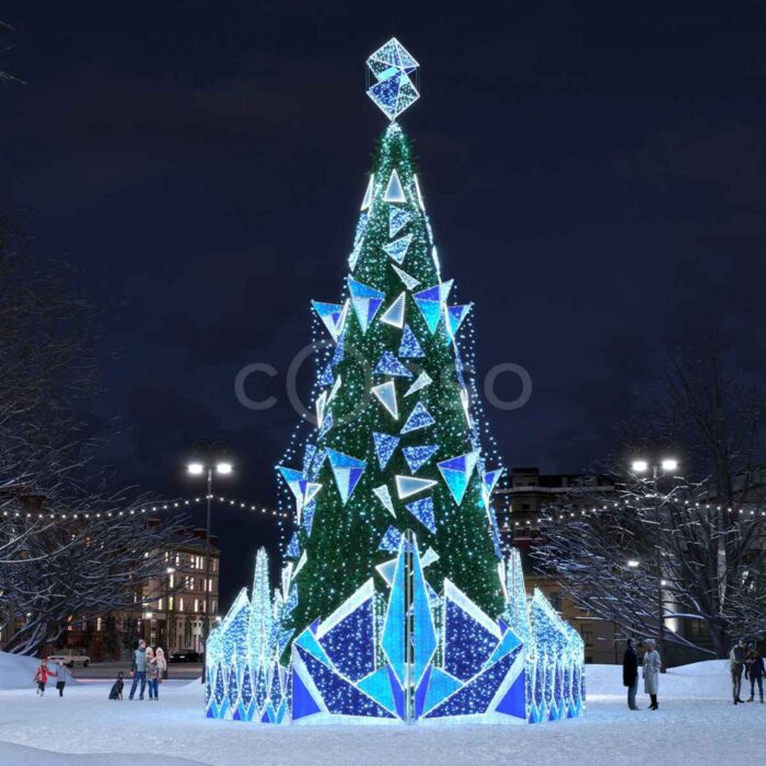 Уличная ель «Хрустальная» — эффектный центр новогоднего оформления площадей, парков и торговых комплексов. Высота до 19 метров, прочный оцинкованный каркас и холодное свечение создают ощущение чистоты и зимнего сверкания. Конструкция с защитой IP65 надёжно работает при −50 °C. Производство и монтаж под ключ от JOYLED в Москве.