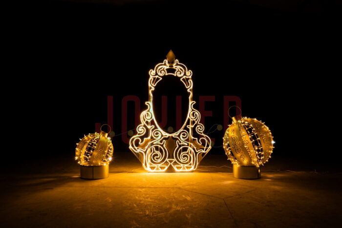 Уличная фотозона «Зеркало» с шарами — эффектная новогодняя инсталляция для улиц, парков и торговых центров. Конструкция выполнена из прочного алюминиевого каркаса и украшена золотым свечением, создающим атмосферу роскоши и праздника. Фотозона устойчива к морозам и влаге (IP65), подходит для круглосуточной эксплуатации на открытом воздухе.