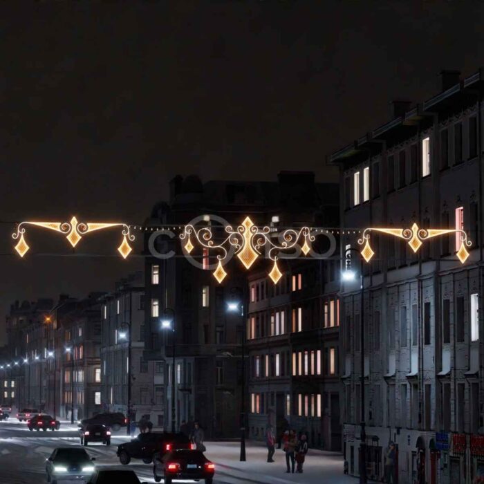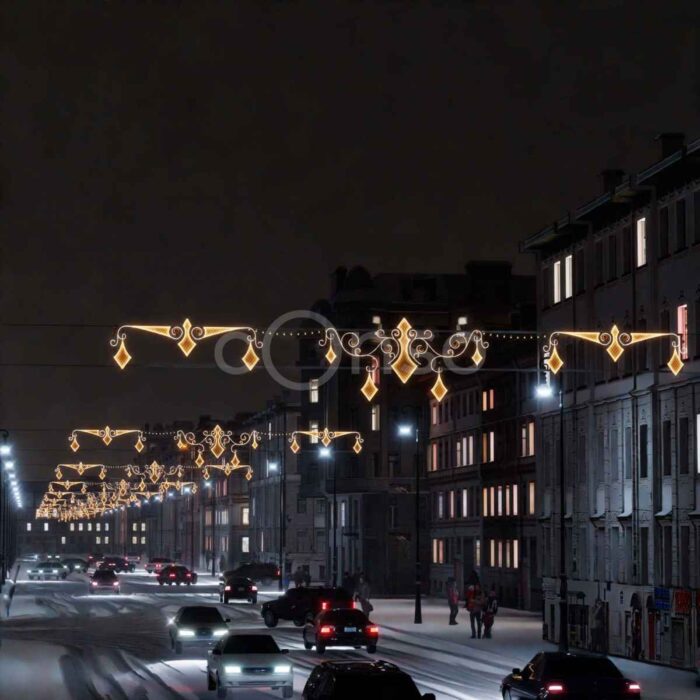 Такой элемент оформления быстро становится доминантой пространства, особенно в вечернее время. Перетяжка создаёт ощущение праздника и притягивает внимание жителей и гостей города. Она также может быть дополнена логотипами, надписями или гербом муниципалитета — по согласованию при изготовлении на заказ.