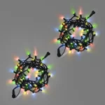 Длина — 10 метров. Структура 5+5: 5 метров с диодами, 5 метров подводка. 100 LED дают плотный световой рисунок. Один режим свечения с эффектом Flash (мерцание) — эффект лёгкой динамики и праздничной живости. Цвет свечения — мультиколор, то есть яркое сочетание красного, синего, зелёного и жёлтого. Это классика уличных украшений: видно издалека, отлично воспринимается зимой и создаёт атмосферу праздника даже в пасмурный день.