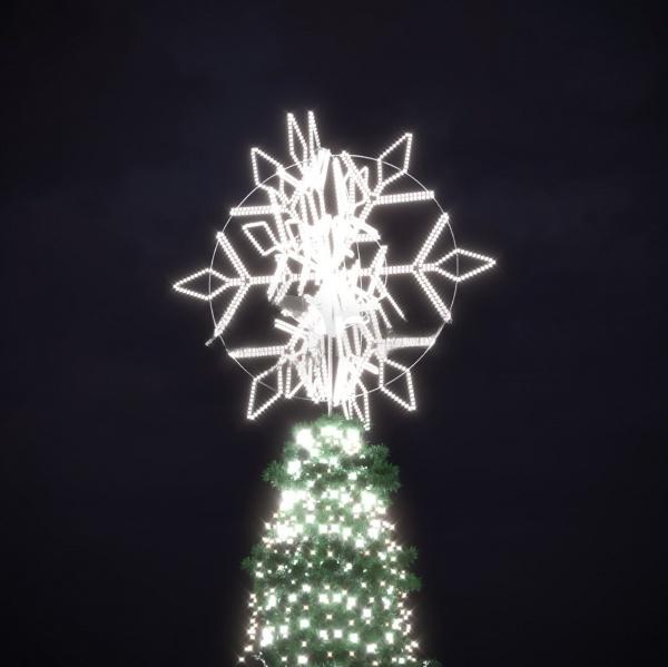 Световая верхушка «Ледяная снежинка» от JOYLED — эффектное завершение для уличной новогодней ели. Объёмная 3D-конструкция из алюминия с холодным свечением. Подходит для оформления площадей, ТРЦ, парков и общественных пространств. Устойчива к морозу, влаге и ветру. IP65, монтаж под ключ.
