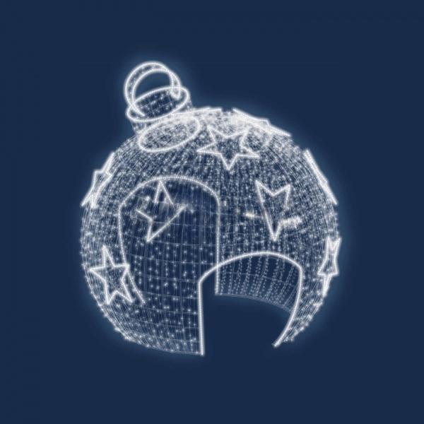 Объёмная входная группа в форме новогоднего шара со звёздами. Размер 5,4×5,9×4,9 м. Каркас из алюминия, свечение холодное, IP65. Станет центральным элементом праздничного декора на площади, перед ТЦ, в парке или сквере. Подходит как входная арка, фотозона или арт-объект. Готова к эксплуатации на морозе и ветре. Подключение — от сети 24 В.
