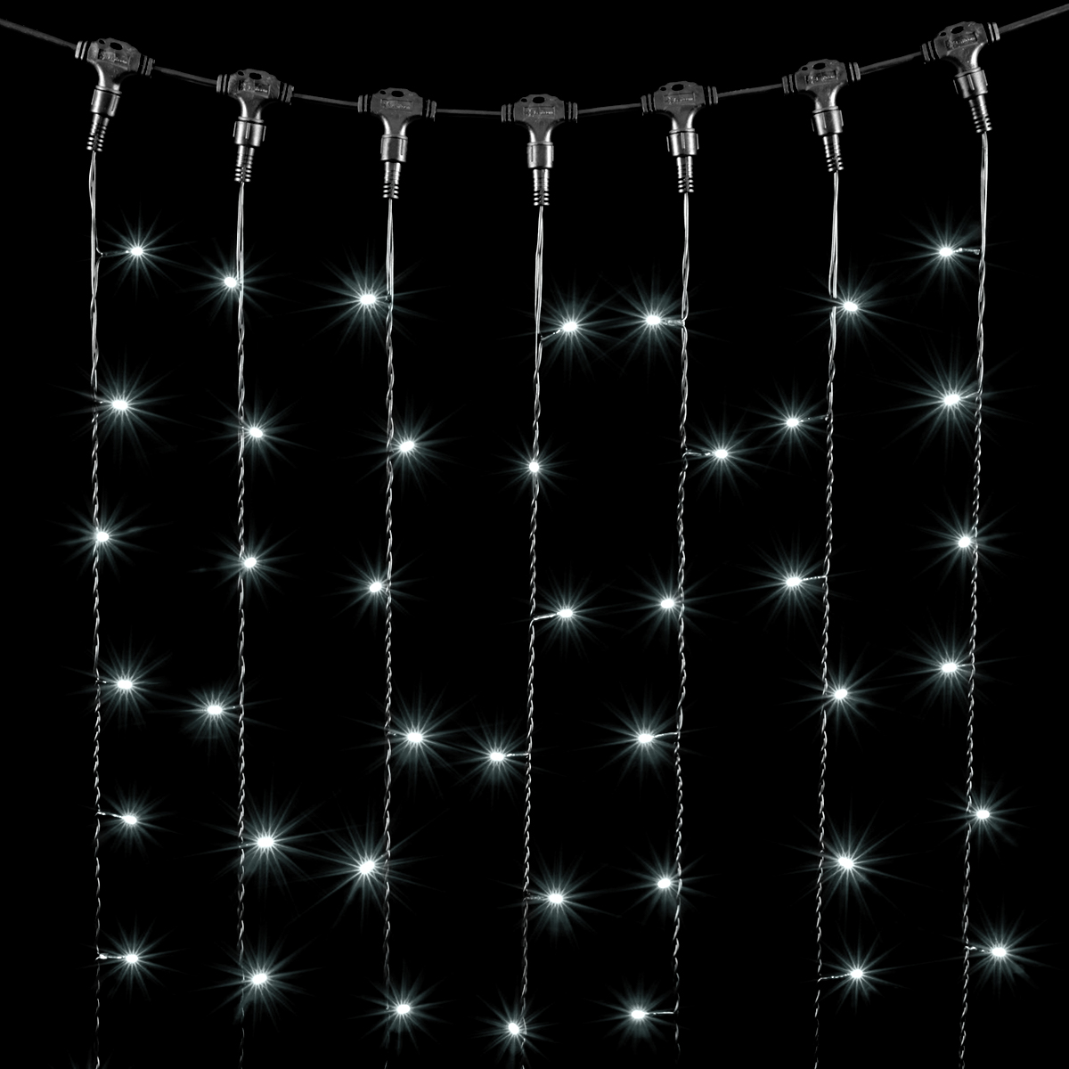 Уличная гирлянда-занавес 2×1 м с колпачками и 200 LED тёплого белого свечения. Подходит для фасадов, колонн и заборов. Степень защиты IP54 позволяет использовать гирлянду при снеге и дожде, а соединение до 10 изделий подряд удобно для масштабных украшений. Черный провод маскируется на тёмных поверхностях.
